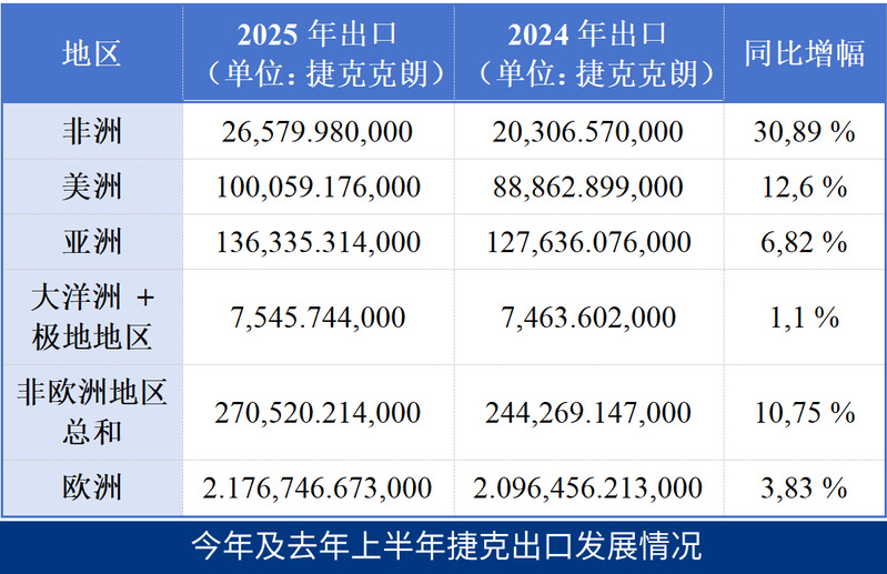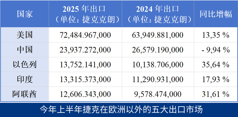 分析人士表示,目前一些亚洲国家的经济形势也相当良好。今年上半年,捷克对亚洲的出口总额同比增长6.8%,达到1363亿克朗。捷克企业向美洲出口了价值约1001亿克朗的商品,同比增长12.6%。其中对美国出口额增长了13.4%,达725亿克朗。分析人士此前曾指出,在美国总统特朗普宣布加征关税之前,捷克企业就已增加了对美出口。