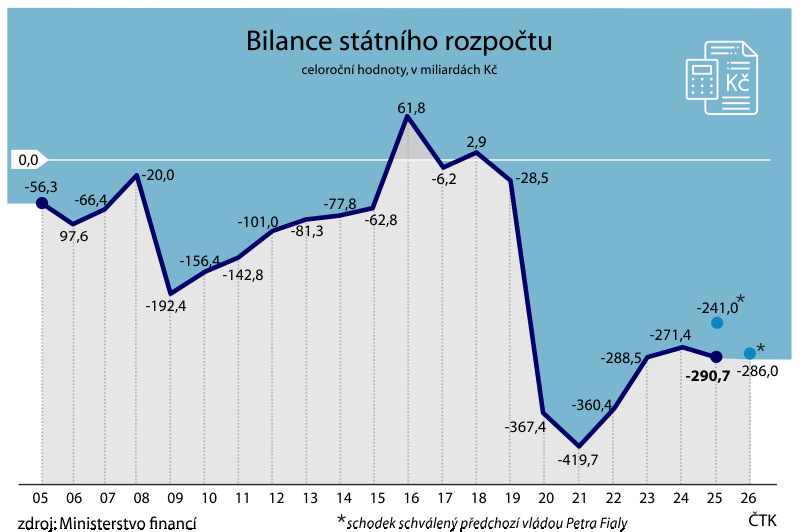 2005-2025年捷克预算执行情况一览图(*前彼得·菲亚拉政府所批准预算赤字)